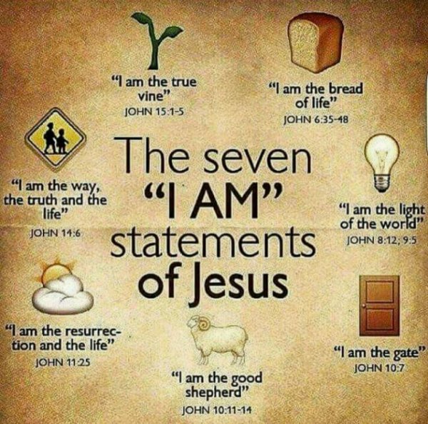 Les titres de Jésus : JE SUIS (Jn 8,24.28.58 ; Jn 13,19)(Titre qui renvoie au nom révélé par Dieu à Moïse sur le mont Sinaï : YHWH (Ex 3,14)(lire « Le Seigneur », car on ne prononce pas le nom divin dans la tradition juive et catholique). Le pain qui descend du ciel (Jn 6,41). Le pain vivant qui descend du ciel (Jn 6.51). La lumière du monde (Jn 9,5). La porte des brebis (Jn 10,7). Le bon berger (Jn 10,11). Le Fils de Dieu (Jn 10,36). La résurrection et la vie (Jn 11,25). La vraie vigne et mon Père est le vigneron (Jn 15,1).