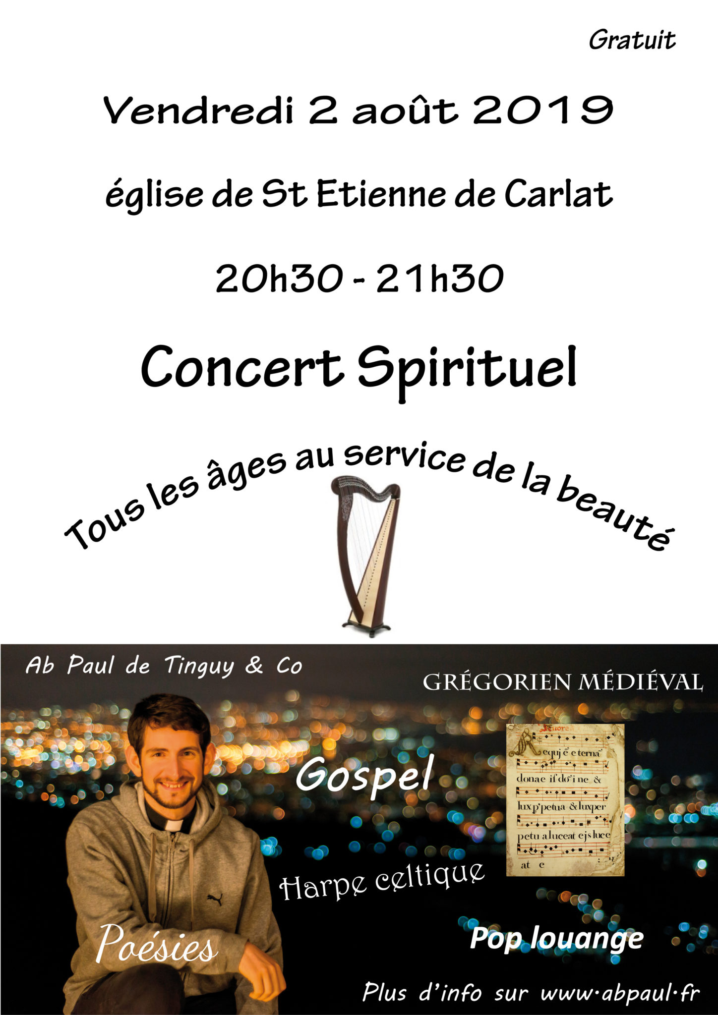 Le concert spirituel, « Les plus beaux chants à Marie », ce sont 14 musiciens cantalous de talent au service de la beauté, pour la plus grande joie de vos oreilles et de vos cœurs. Cabrette, violoncelle, violon, flûtes, piano, synthé, bodhran, cajon, guitares acoustiques, guitare électrique, guitare basse, chanteuses lyriques, voix polyphoniques.